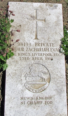 Arthur Zachariah Evans was born in the March quarter of 1899, in Trefeglwys, Montgomeryshire and was the youngest son of Thomas Evans and his wife Elizabeth (nee Jones). His parents married in about 1880 and had ten children, one of whom died young.  Arthur had older sisters Sarah Elizabeth, Mary Phoebe, Hannah Matilda, Priscilla Ann, and Eunice Margaret, and older brothers Thomas Edward,  Evan William, and David Jones. His parents were farmers and lived in Geseilfa, Llawryglyn, Trefelglwys.  The family spoke both English and Welsh.