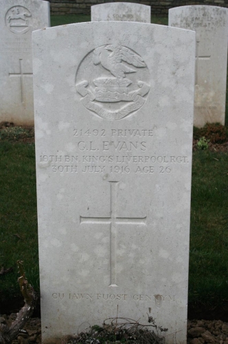 “In loving remembrance of Private G.L. Evans (Griff), 19th King’s Liverpool Regiment (“Pals”) killed in action near Guillemont on the morning of July 30, 1916. God was with him, he did not blench. Mam, Dad, and Arthur.”