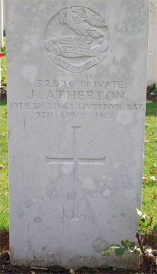 James Atherton was born in Liverpool on 07th April 1880 at 6 Mabb Lane near Deysbrook Lane, Liverpool to James Atherton a West Derby born Liverpool Council labourer and his West Derby born wife Emily Jane (nee Eaves) who married at St Mary's Church, Edge Hill on 02nd October 1878.